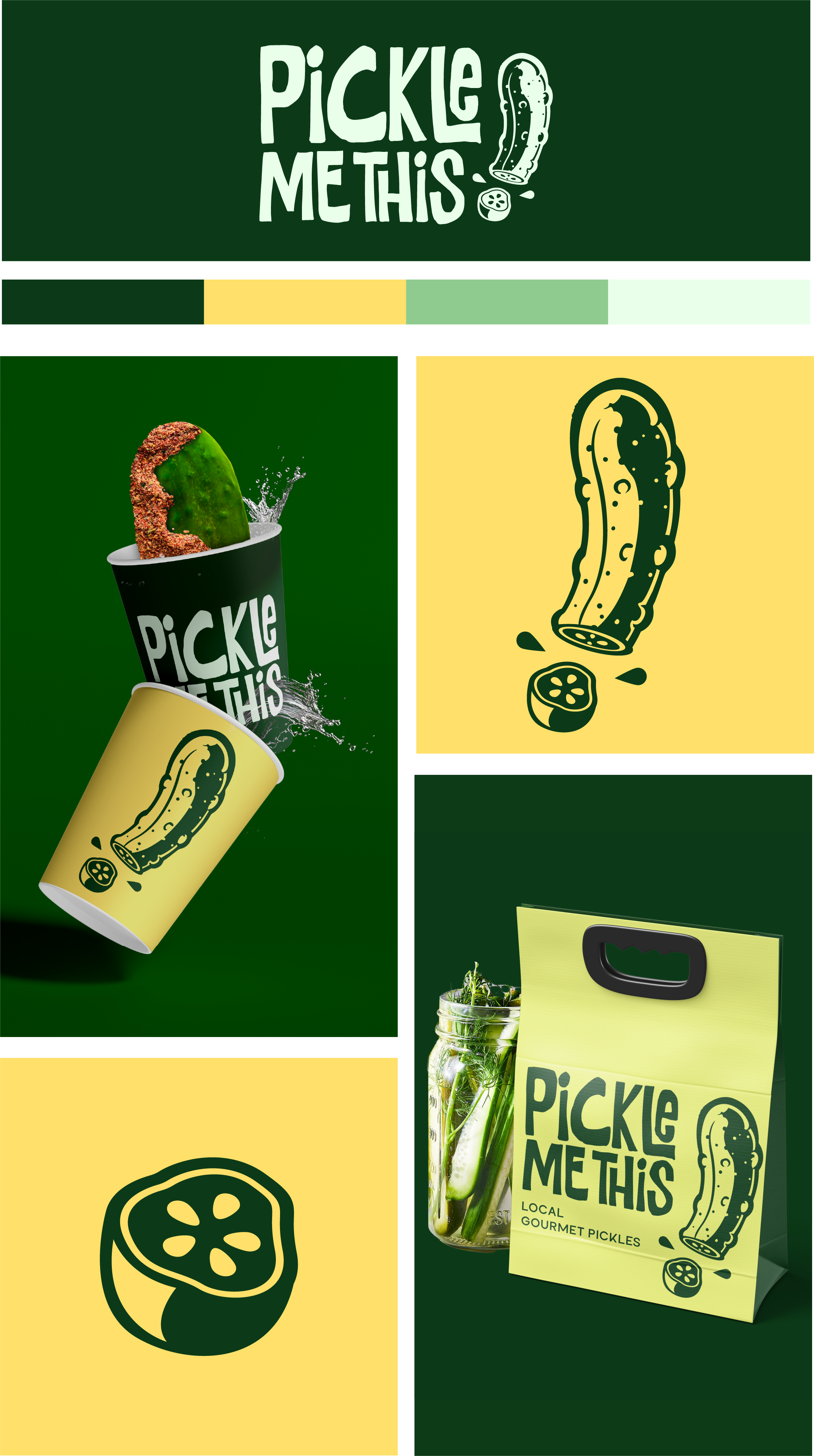 Pickle Me This is a playful gourmet pickle pop-up built around bold flavor and personality. I developed the full brand identity, from naming and visual system to marketing assets and on-site production, using punchy typography, vibrant color, and a cheeky tone to make the brand instantly memorable. The result is a cohesive, high-impact presence that turns a simple product into a fun, shareable experience.
